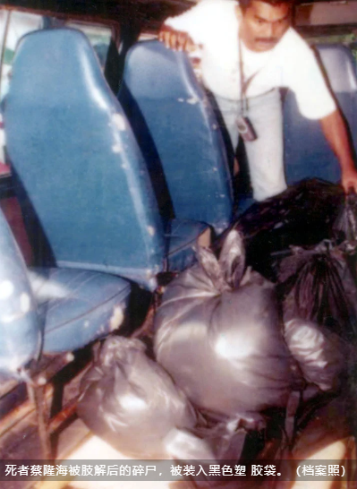 蔡隆海的尸体在警方到达现场时已被肢解,全身赤裸,头颅被砍下,左眼球被挖出,生殖器不见,心脏被剖开,内脏被掏空,令人毛骨悚然。警方在现场发现与邪教仪式有关的物件,使这起案件与著名的女巫莫娜的杀人碎尸案产生联想。