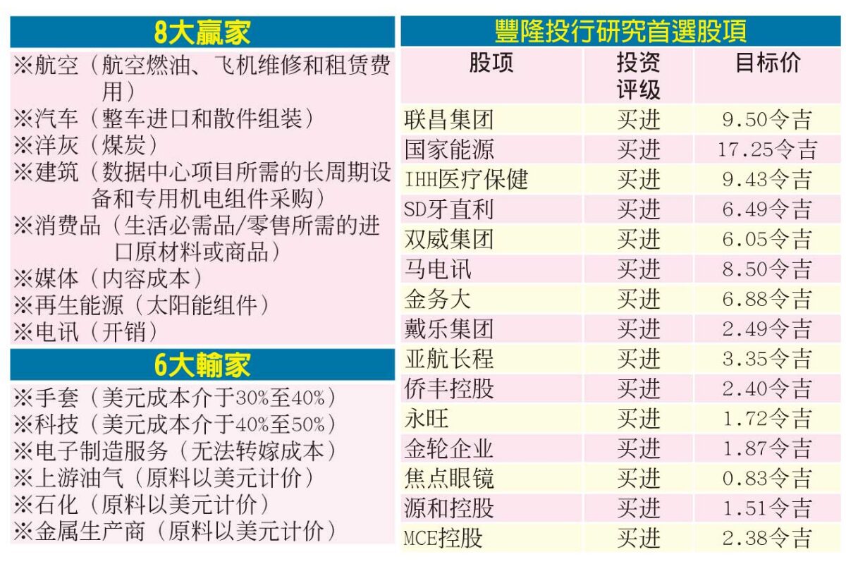 相比之下,出口导向型企业因收入多以美元计价,而缺乏足够美元成本自然对冲,盈利可能受压。涉及手套、科技、电子制造服务、上游油气、石化及金属生产商等行业,受汇率波动影响更大。投行提醒,短期内出口企业利润空间可能被压缩,投资者在评估公司财务状况时需谨慎。